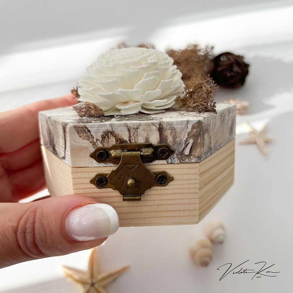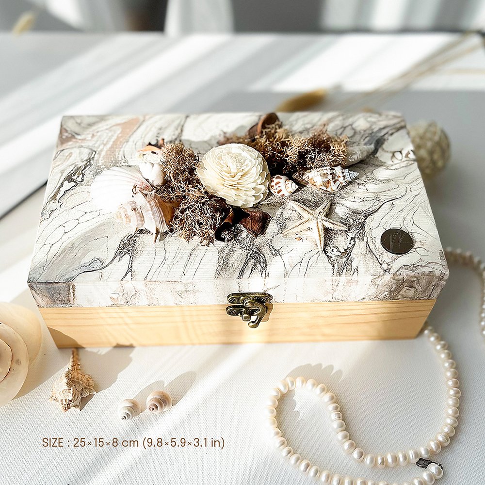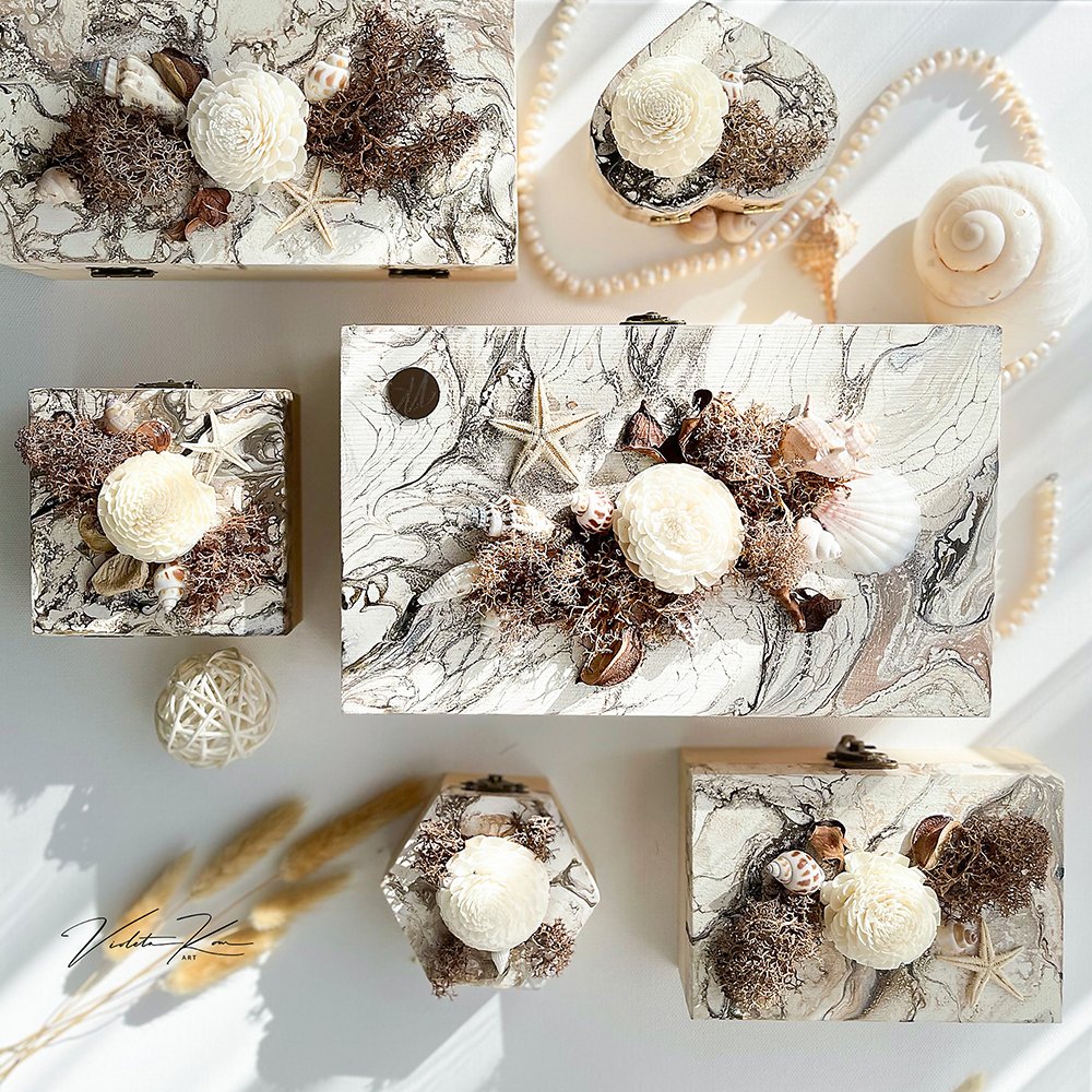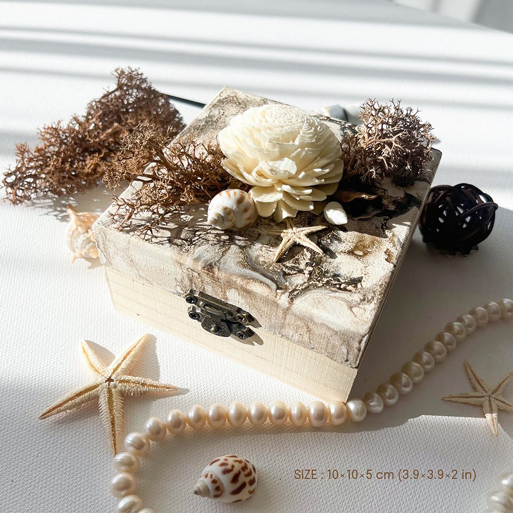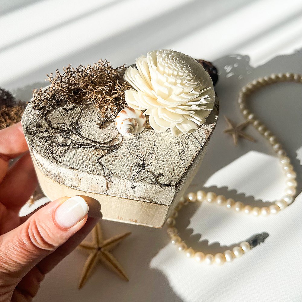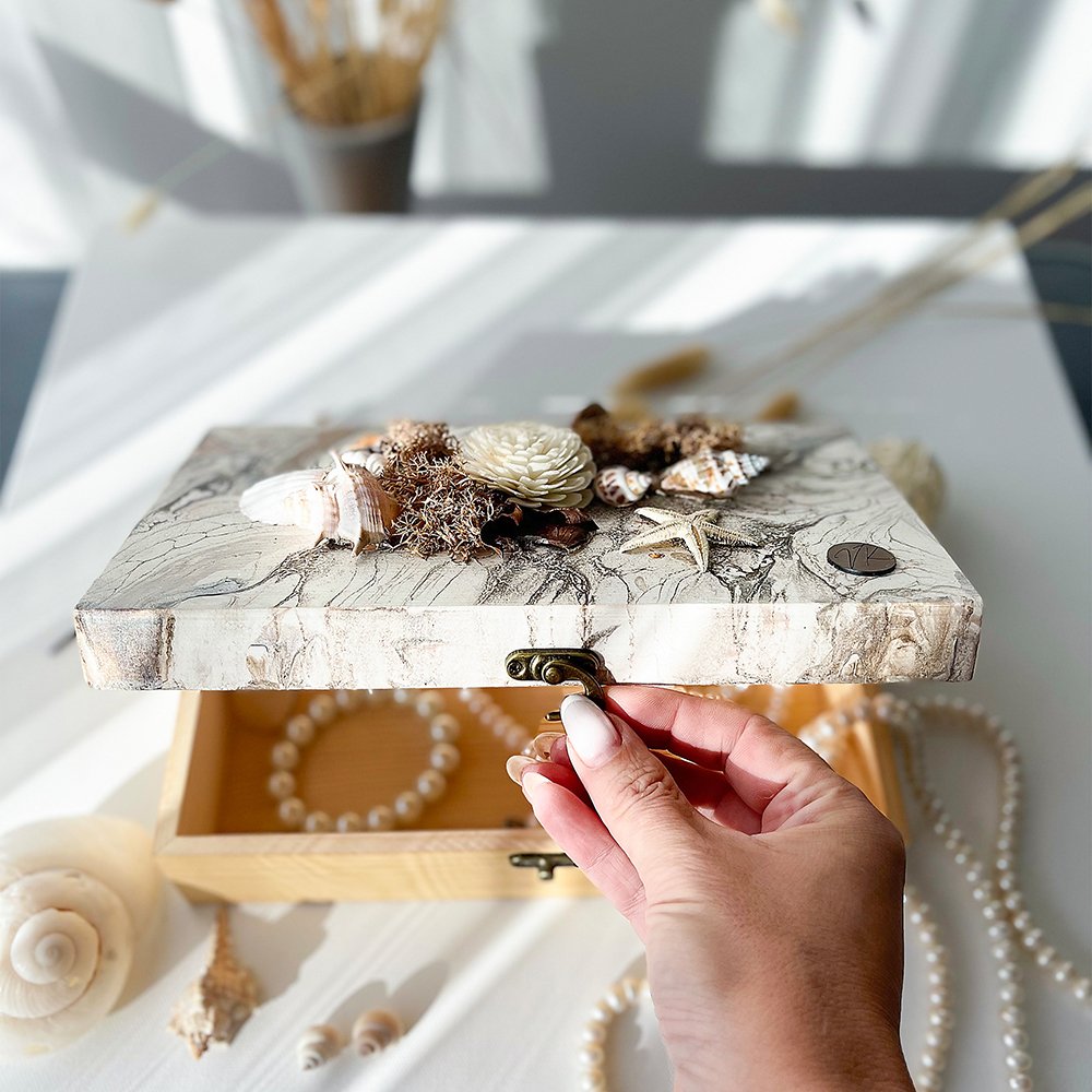 Šios medinės dėžutės – tarsi tylūs gamtos laiškai. Kiekviena jų tapoma akriliniais dažais švelniais, organiškais atspalviais, primenančiais smėlį, dreifuojančią medieną ir jūros putą. Viršelis papuoštas natūraliais lobiais – stabilizuotomis Baltijos samanomis, sola medžio žiedais ir jūros kriauklėmis – kuriant harmoningą meno ir gamtos sintezę.