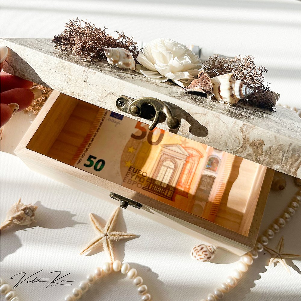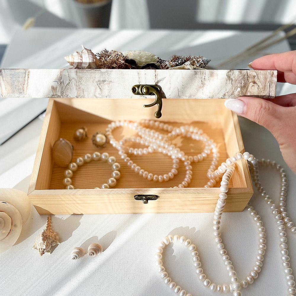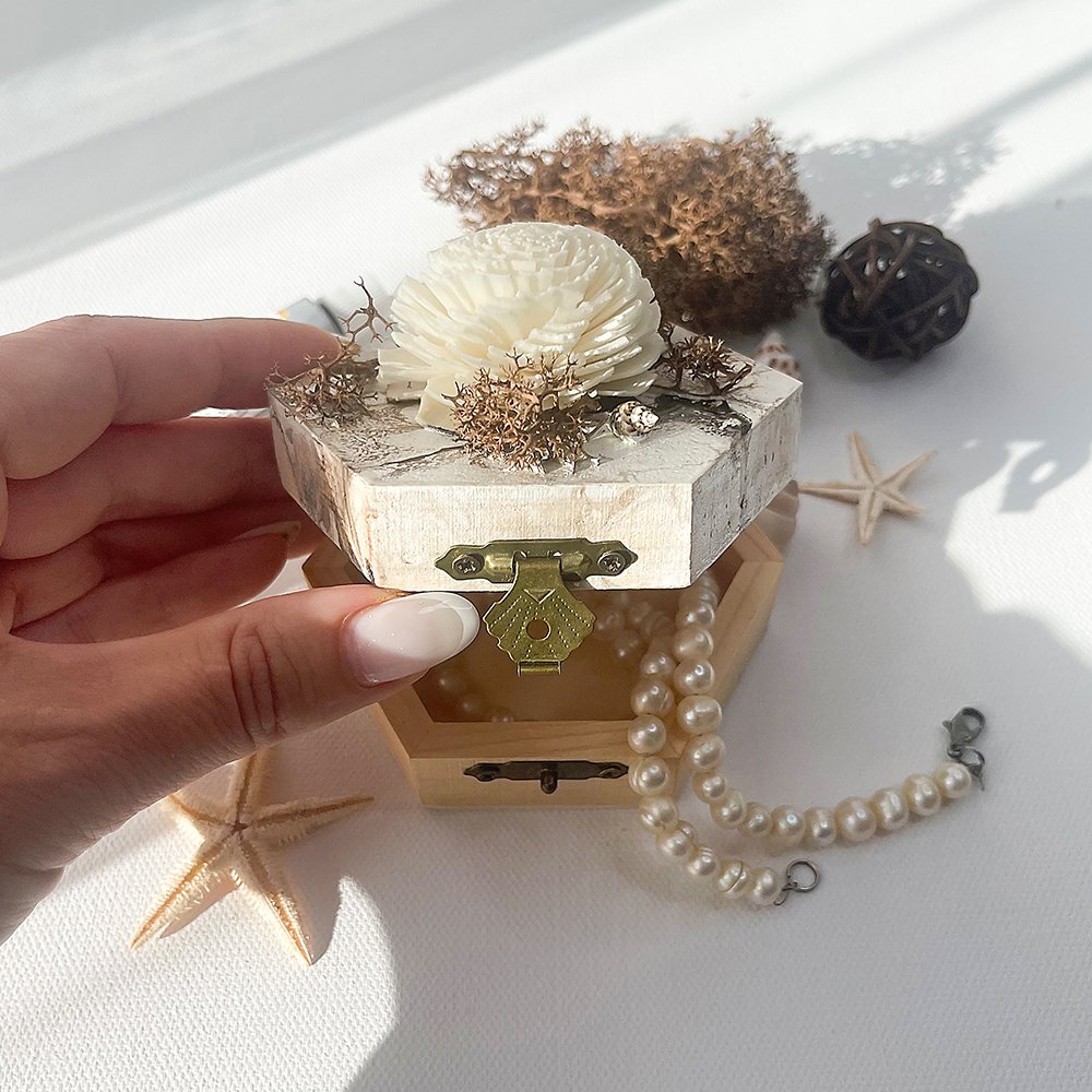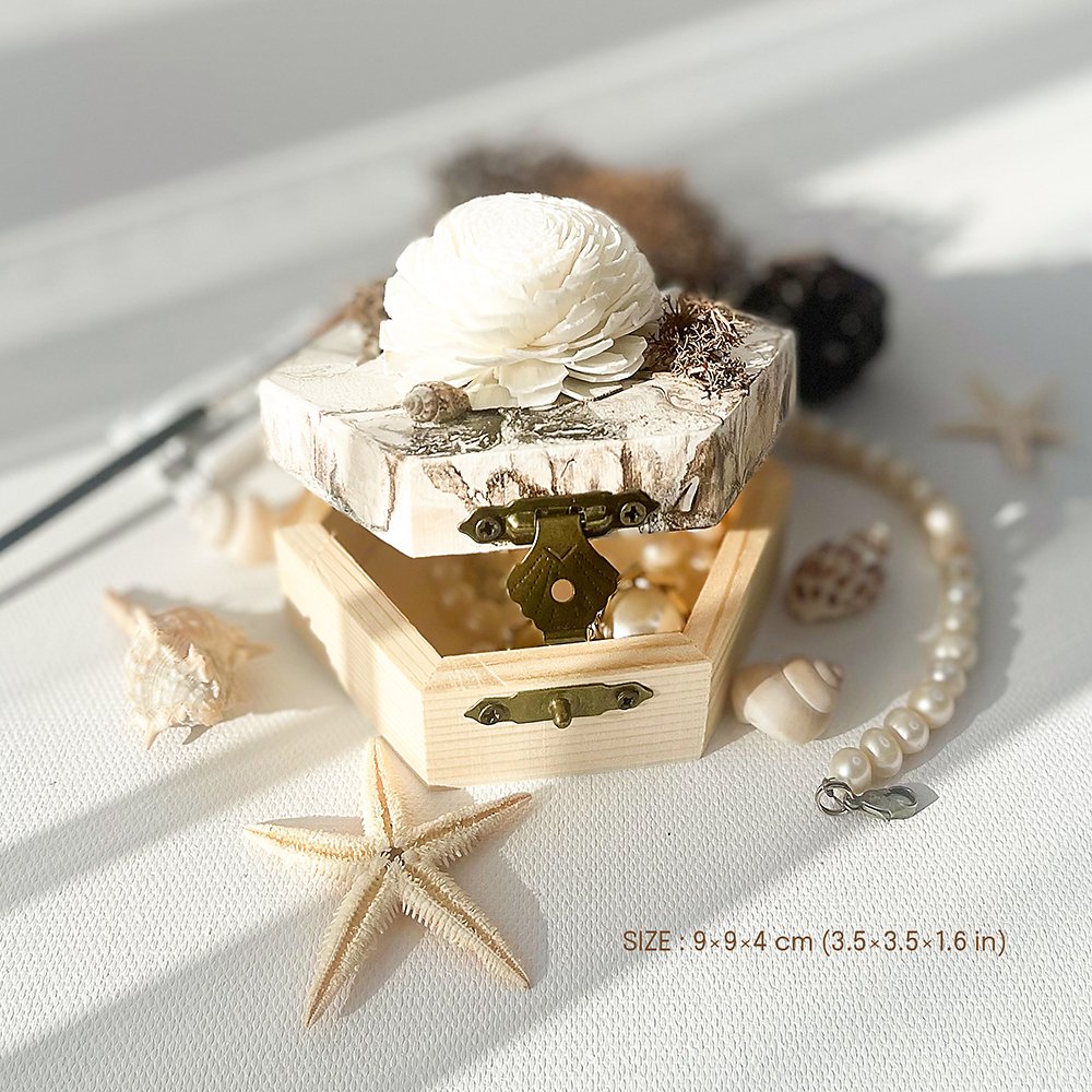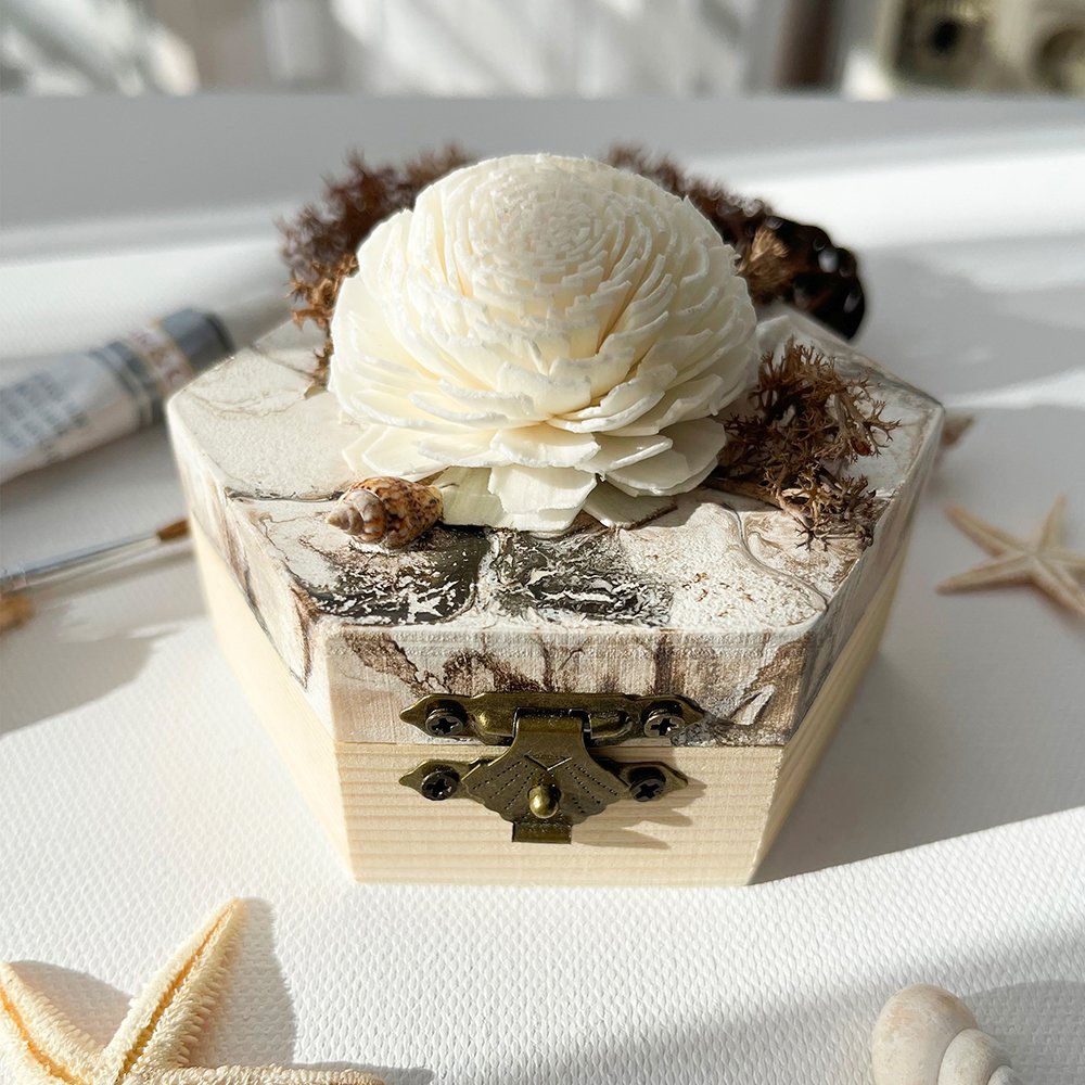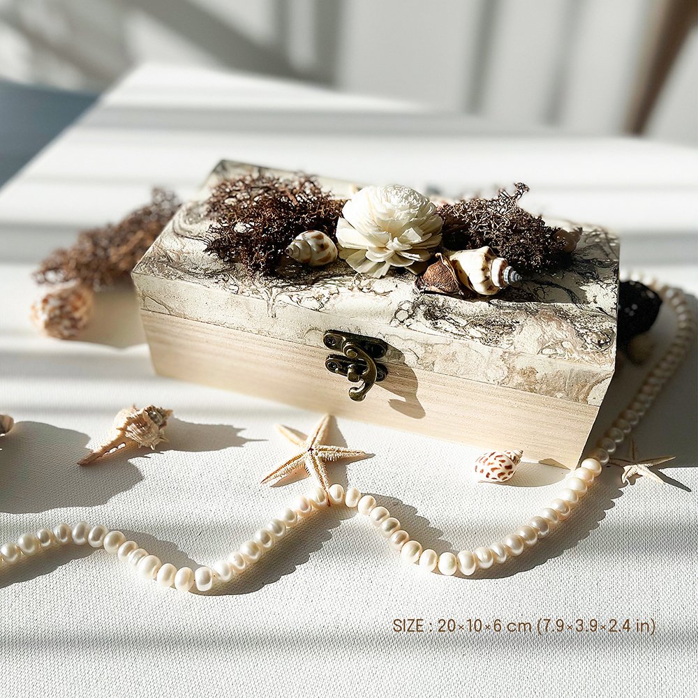 Šios medinės dėžutės – tarsi tylūs gamtos laiškai. Kiekviena jų tapoma akriliniais dažais švelniais, organiškais atspalviais, primenančiais smėlį, dreifuojančią medieną ir jūros putą. Viršelis papuoštas natūraliais lobiais – stabilizuotomis Baltijos samanomis, sola medžio žiedais ir jūros kriauklėmis – kuriant harmoningą meno ir gamtos sintezę.