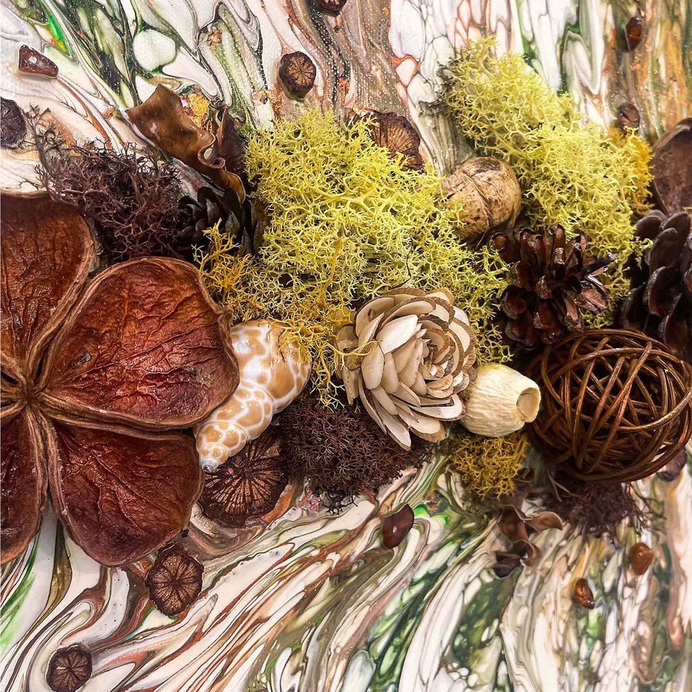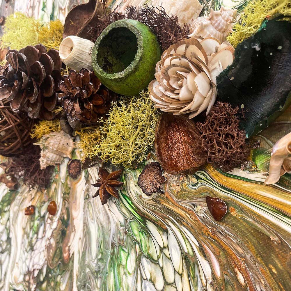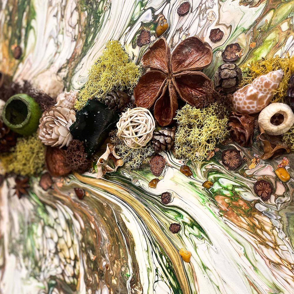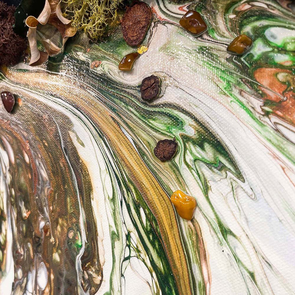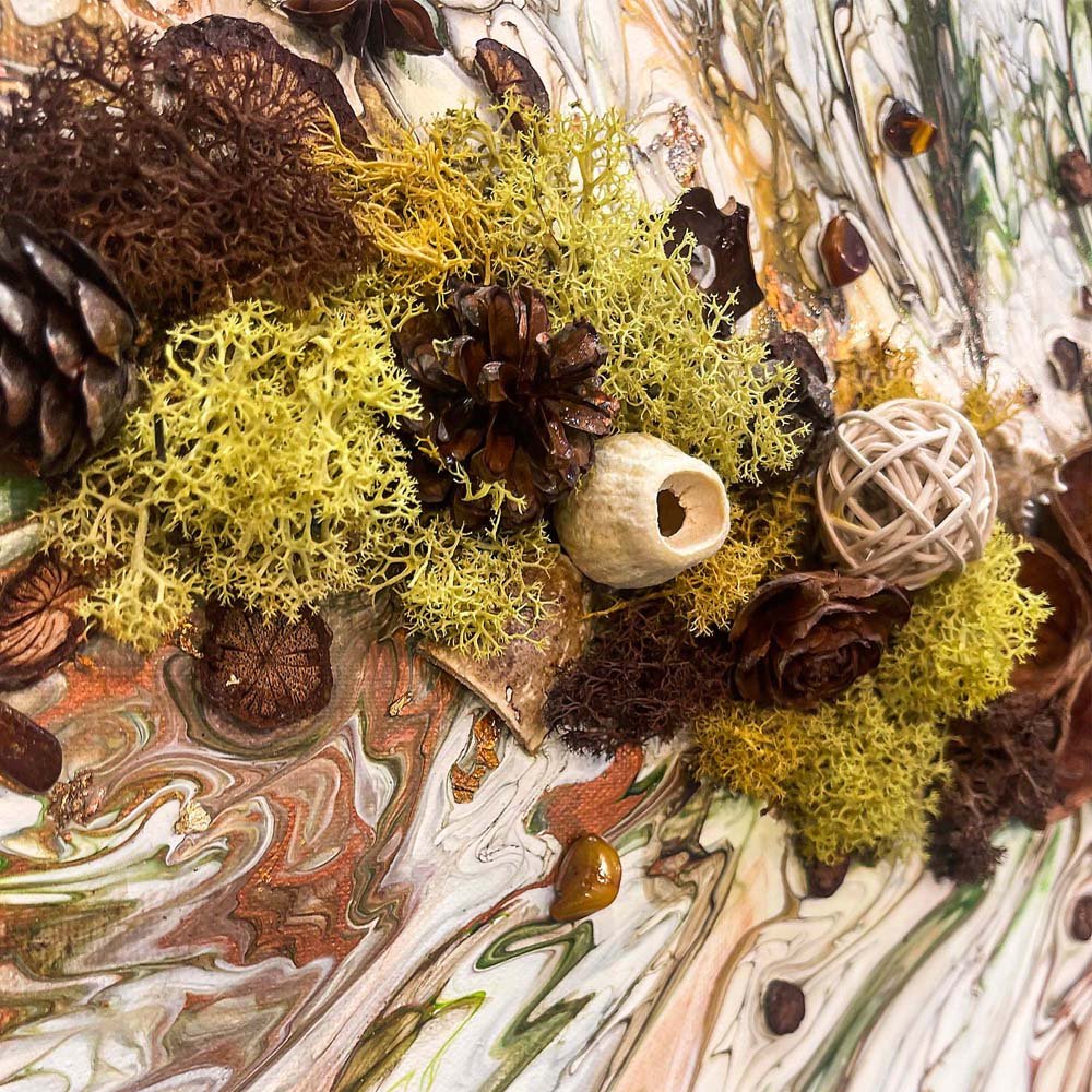 Šis kūrinys yra susipynęs šokis tarp žmogaus sielos ir miško — ten, kur spalvos, pojūčiai ir tekstūros susilieja į vieną bendrą ritmą. Žemiški tonai, samanų žaluma, auksiniai žybsniai ir švelni šviesa susijungia į šiltą, natūralią harmoniją. Tikri miško elementai — kankorėžiai, samanos, mediniai žiedai, žievės gabalėliai ir švytintys gintaras — kuria turtingą, gyvą tekstūrą, lyg mažus gamtos fragmentus, nešiojamus tavo širdyje.