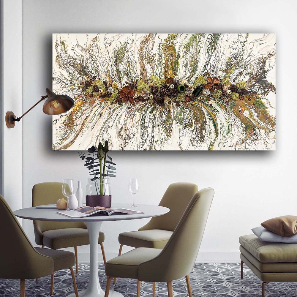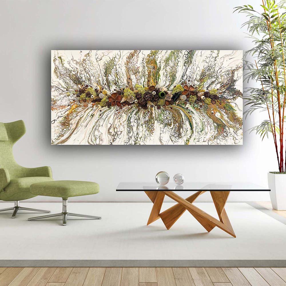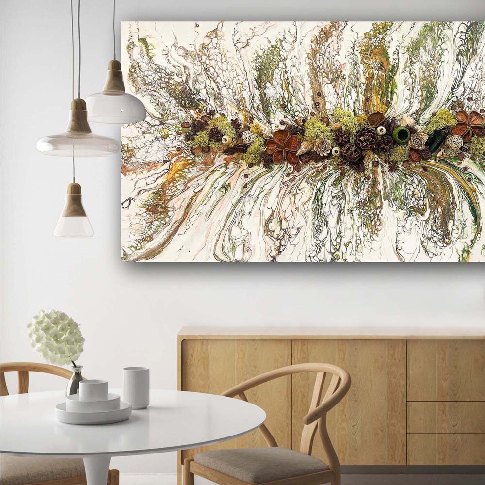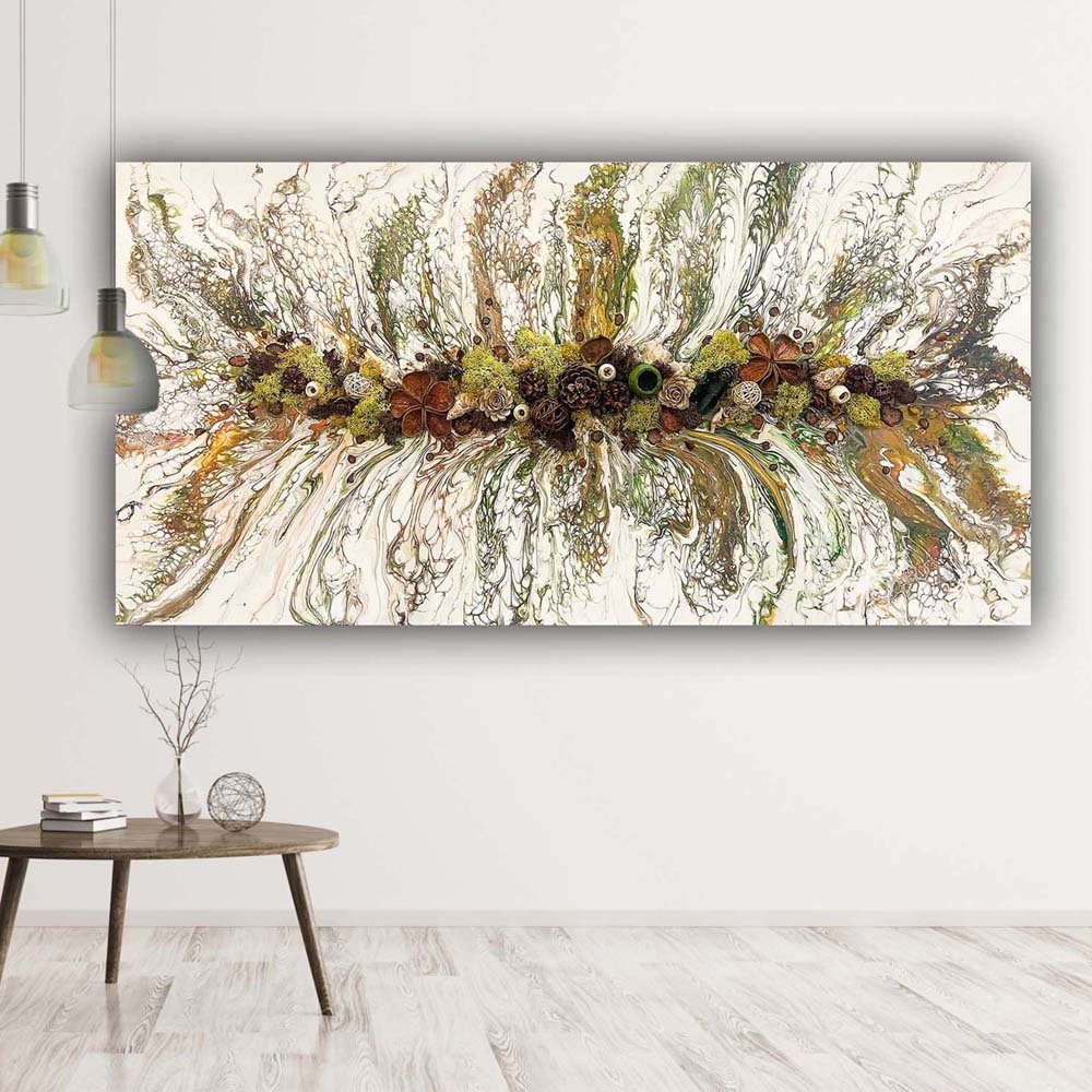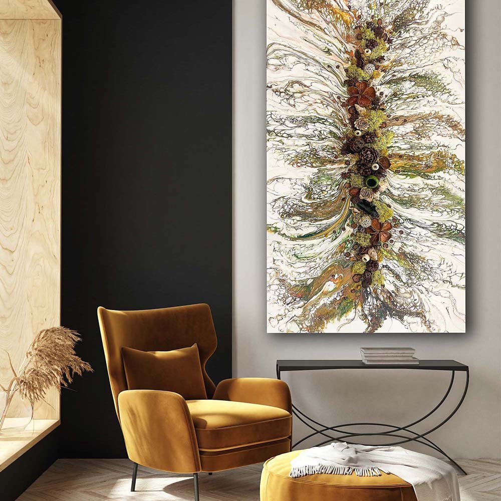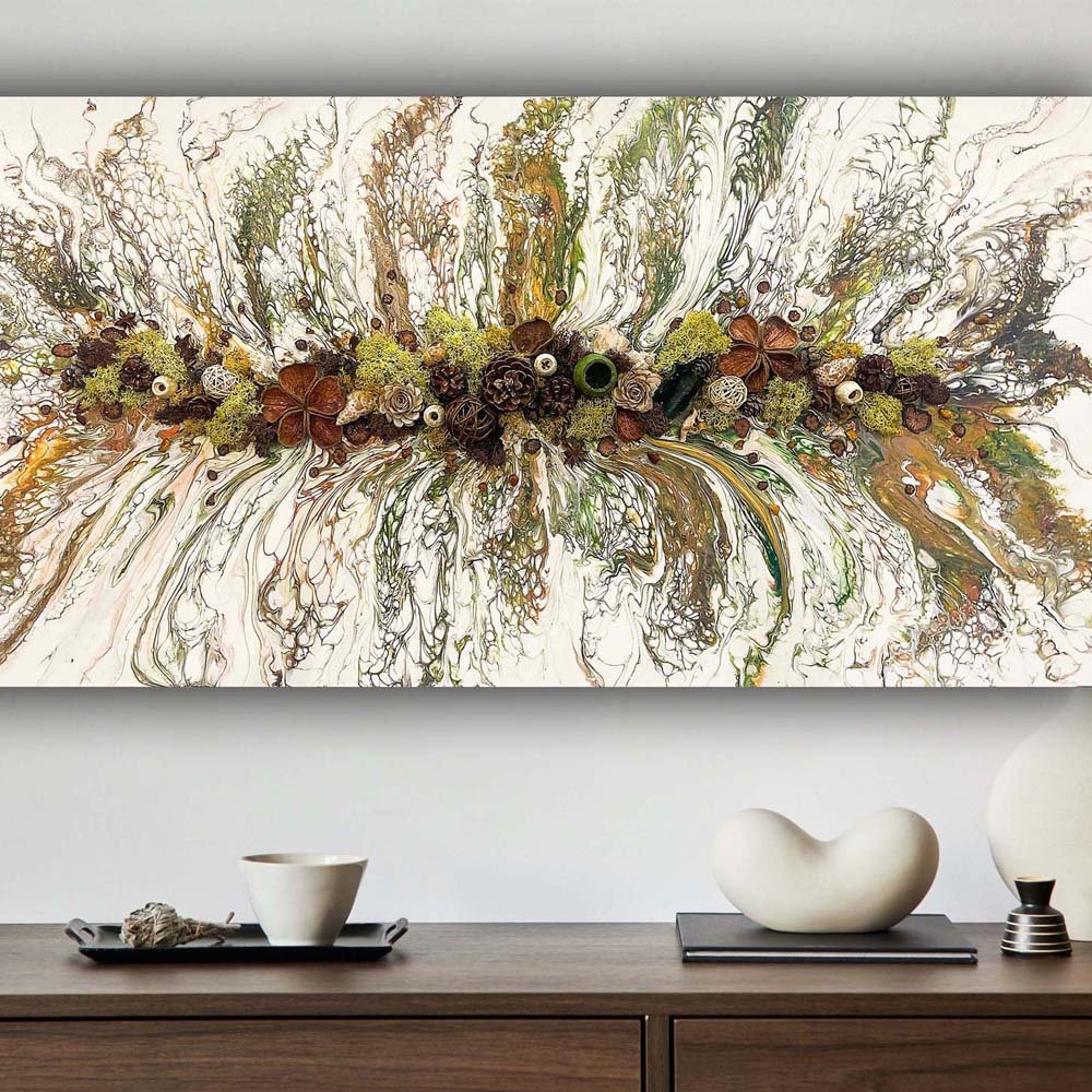 Šis kūrinys yra susipynęs šokis tarp žmogaus sielos ir miško — ten, kur spalvos, pojūčiai ir tekstūros susilieja į vieną bendrą ritmą. Žemiški tonai, samanų žaluma, auksiniai žybsniai ir švelni šviesa susijungia į šiltą, natūralią harmoniją. Tikri miško elementai — kankorėžiai, samanos, mediniai žiedai, žievės gabalėliai ir švytintys gintaras — kuria turtingą, gyvą tekstūrą, lyg mažus gamtos fragmentus, nešiojamus tavo širdyje.